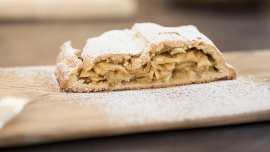 Den Strudel mit dem verquirlten Ei bestreichen, mit den restlichen Teigstreifen verzieren und im Backrohr backen. Mit Staubzucker bestreuen.