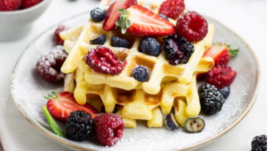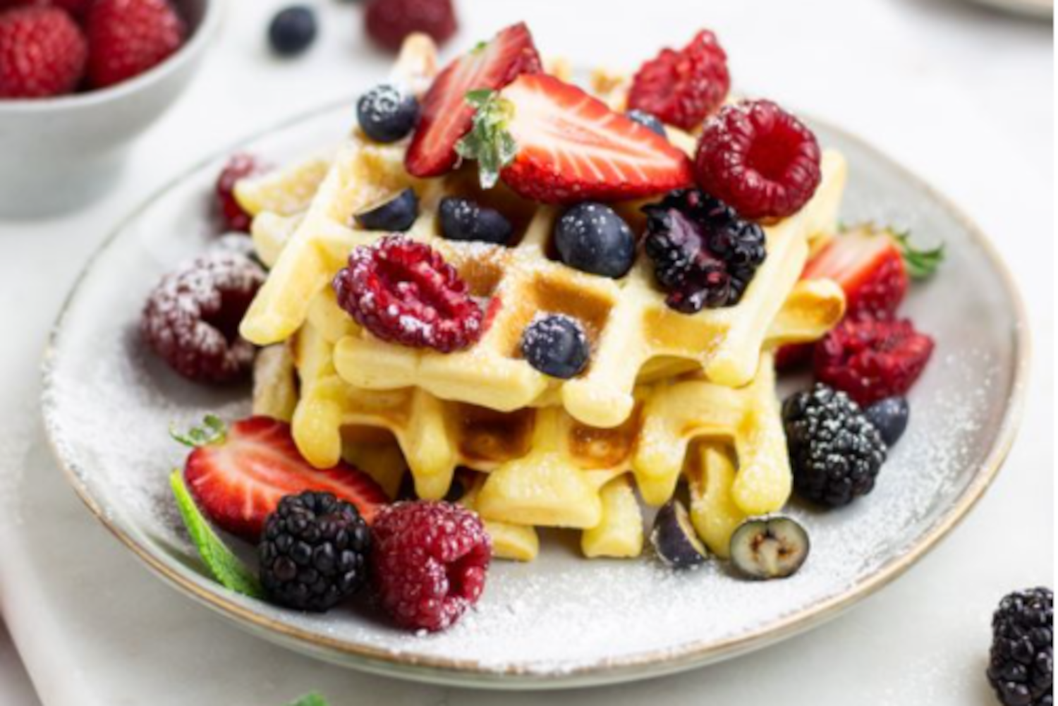 Die Waffeln vor dem Servieren nach Belieben mit Waldfrüchten garnieren.