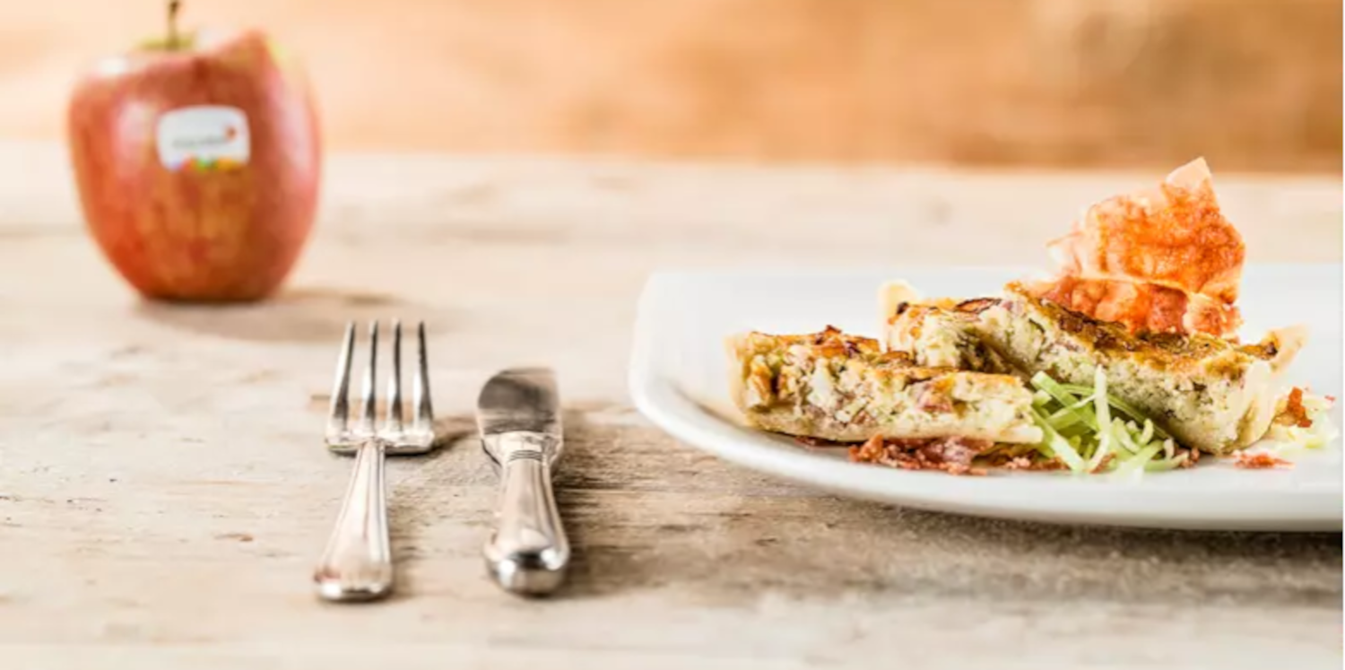 Mehl und Salz in einer Schüssel mischen, Butter und Wasser verrühren und auf einmal zur Mehl-Salz-Mischung geben. Mit dem Handmixer zu einem weichen, glatten Teig verrühren (Teig nicht kneten!). Teig flach drücken, in Klarsichtfolie wickeln oder in einen Plastikbeutel geben und ungefähr 30 Minuten kühl stellen. Kuchenteig ausrollen, mit der Gabel dicht nebeneinander einstechen und in die ausgebutterte Form legen. Speckwürfel in einer Pfanne etwa 2 Minuten anbraten. Lauch dazugeben und ungefähr 5 Minuten mitbraten, alles in eine Schüssel geben. Sahne, Eier, Äpfel, Salz und Pfeffer gut verrühren. Lauch-Speck-Mischung dazugeben und alles auf dem Teigboden verteilen.