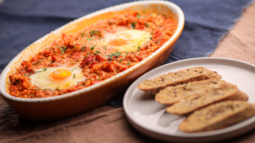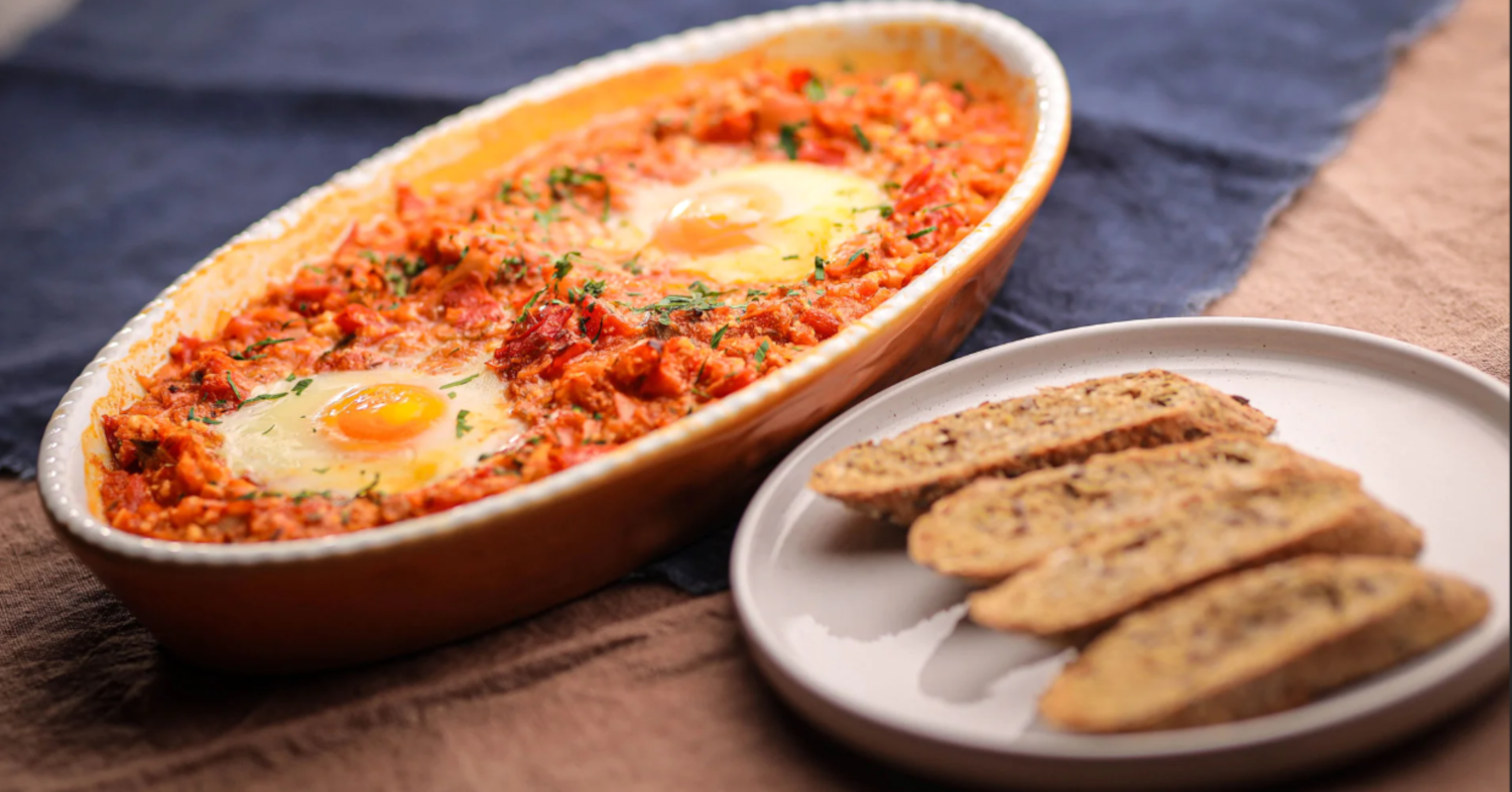 Danach die Pfanne aus dem Ofen nehmen, mit dem Koriander und der Petersilie bestreuen und zusammen mit den Brotscheiben servieren, wobei das Brot auch wie ein Löffel verwendet werden kann.